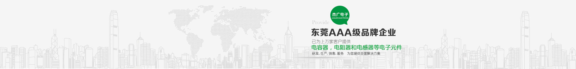 東莞市杰廣電子有限公司是一電子元件之專業(yè)制造廠 ,銷售遍及世界各地,主要產品包括:電容器,電阻器和電感器等電子元件,以供應汽車,通訊,電腦,音響,影像,電動工具,儀表,以及軍用電子等工業(yè)之電子元件使用。